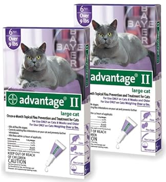 Advantage II Flea Control Large Cats over 9 lbs Keep your cat and your home safe from fleas with Advantage II Large Cats over 9 pounds. Formulated for cats eight weeks and older and weighing over 9 pounds, Advantage II kills fleas within hours of application and protects against future flea infestations. The Importance of Flea Protection Protecting your cat from fleas is essential for health and well-being. Flea bites not only cause discomfort for your cat, but also can cause irritation that can lead to skin infections. In some cases, flea bites can lead to allergic skin reactions, or even result in the transmission of other disease-causing organisms, such as tapeworms. Flea life cycle. . Kills Fleas Within Hours of Application Millions of pet owners have found success against fleas with Advantage Topical Solution. Its successor, Advantage II, kills even more flea life stages. Advantage II kills fleas through contact, so they don't even have to bite to be destroyed. This helps reduce the risk of secondary problems, such as flea-allergy dermatitis. The active ingredient in Advantage II, imidacloprid, acts on the nervous system of the flea to cause paralysis and subsequent death. Advantage II destroys the fleas living on your cat within 12 hours of application, providing quick relief for your pet. Reinfesting fleas (newly hatched fleas jumping back on your cat) are killed within two hours of application, so if your pet picks up fleas from another animal or infested environment, those fleas will be killed as well. Advantage II Flea Control Large Cats over 9 lbs Kills fleas within hours of application Breaks flea life cycle, protecting against future flea infestations Waterproof formula won't wash off Easy to apply Includes twelve convenient one-month doses For cats eight weeks and older and weighing over 9 pounds The adult fleas you see are only a small percentage of the infestation. . Protects Against Further Flea Infestations If you
