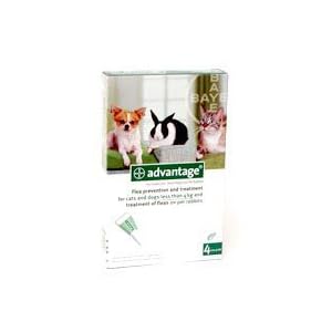 Bayer Advantage Spot On For Dogs, Cats ; Rabbits Upto 9lbs (4kg). Each pack contains 4x 0.4ml Pipettes of Advantage. This sale is for 1 pack of 4 pippetes Flea prevention and treatment for cats and dogs, treatment of fleas on pet rabbits and treatment of biting lice on dogs Important Product information: Advantage has been approved for sale in the UK by the VMD and by the FDA in the U.S.A. Both the UK and U.S.A. products are identical formulations containing the same active ingredients, the products sold by us are sold in UK packaging. We are a licensed wholesaler and retailer and all products listed are 100% sourced from the original manufacturer. Where products are licensed for exactly the same use in the destination country the animal owner is legally able to choose where to source the products from.