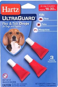 For dogs ; puppies weighing 16-30 lbs. 3 Monthly treatments. Kills: Fleas; Ticks; Mosquitoes. Effective flea and tick control. Prevents re-infestation for 30 days.